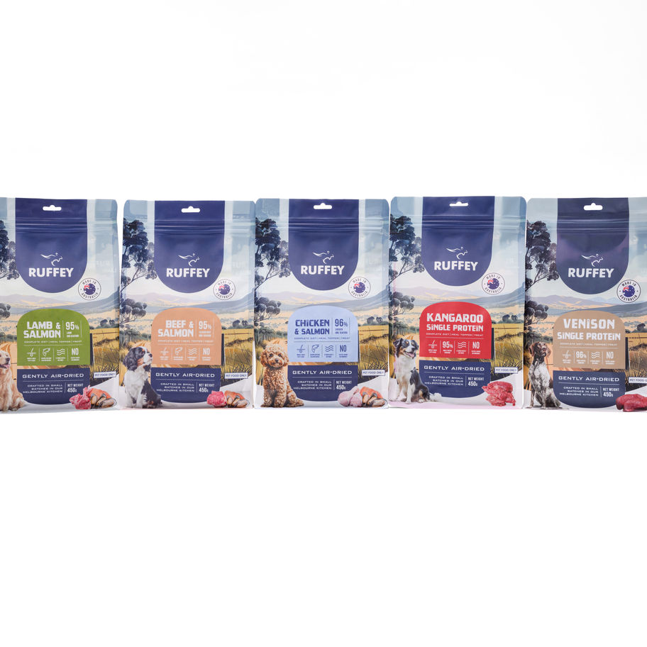 Unlike conventional dog foods that are rapidly cooked at high temperatures, Ruffey’s slowly air-dries its meals in small batches. This gentle dehydration method helps preserve natural nutrients and rich flavours while maintaining rigorous quality standards. Every batch is produced under strict controls that meet and exceed PrimeSafe and PFIAA regulations.
