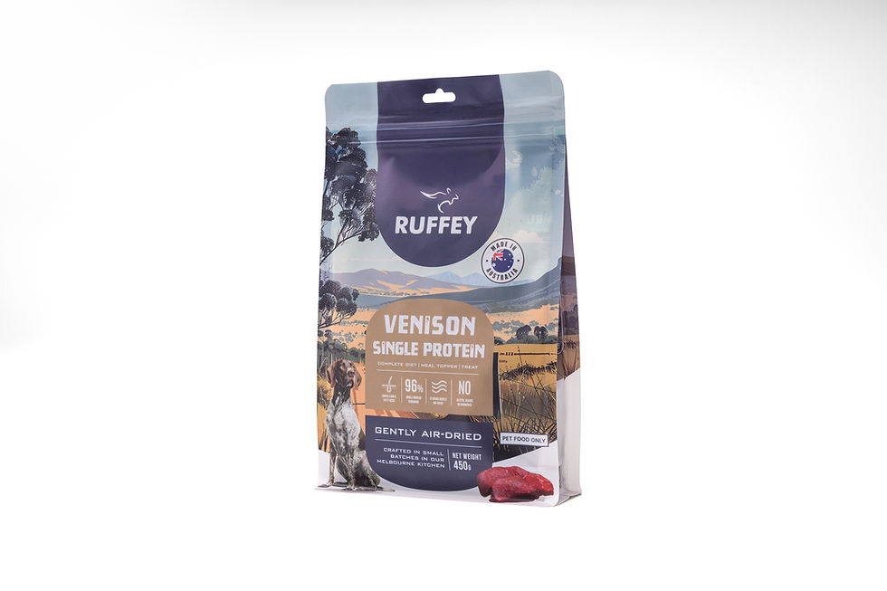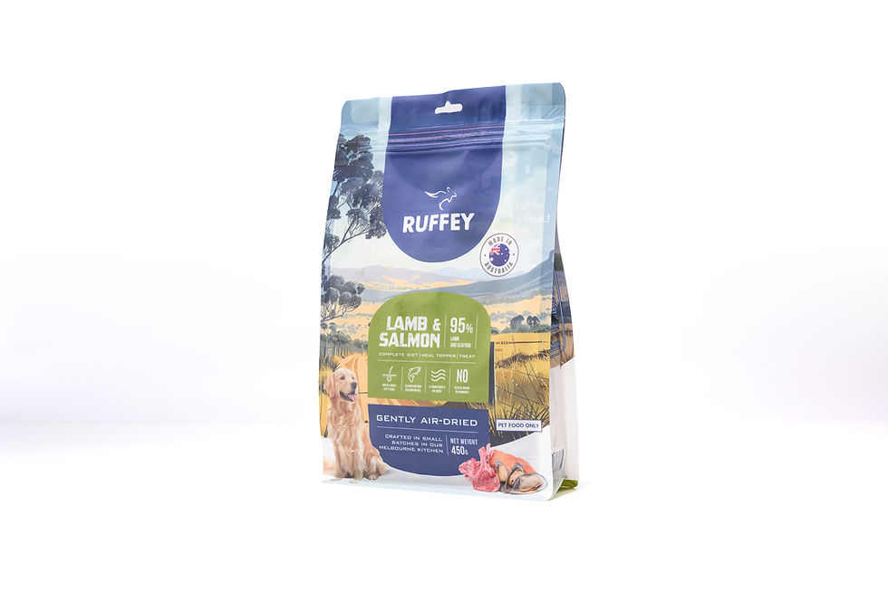 Ruffey’s Premium Air Dried Dog Food delivers over 45% protein, combined with fruits, vegetables, and seeds for balanced nutrition. Gently air dried in small batches, it preserves nutrients and flavour while meeting strict SafeMeat, PFIAA, and AAFCO standards—ensuring complete, high quality meals that support healthy digestion and overall well-being.