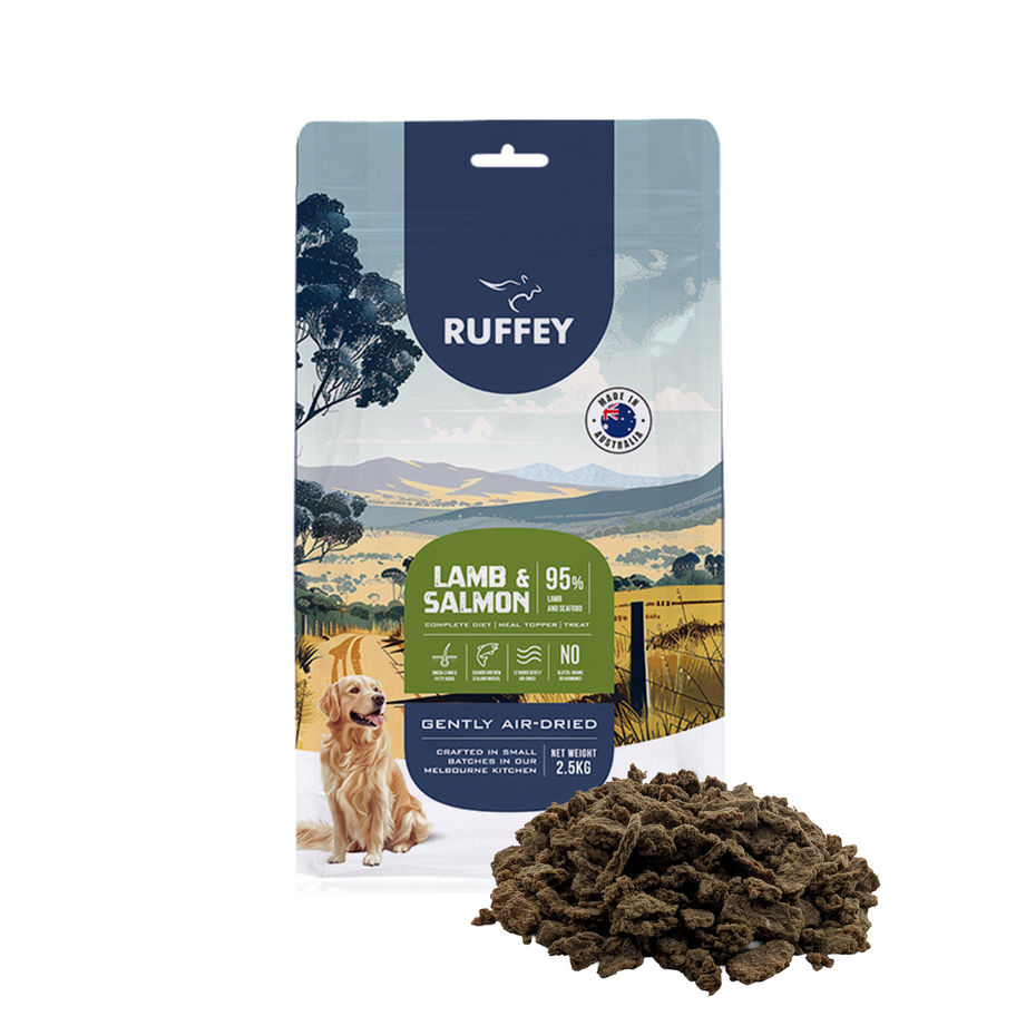 Ruffey Australian Pasture Raised Lamb & Tasmanian Salmon Gently Air Dried Dog Food For our best friends, "good enough" isn't enough; they deserve the foundation for a long and vibrant life powered by a diet that respects their biological roots. Based in Melbourne, Ruffey is a family owned Australian leader in pet wellness, bridging the gap between ancestral wisdom and clinical precision. Our journey led us back to the land, where the Australian Outback has held the secret to perfect preservation for thousands of years through natural air drying. In our state of the art 5,000sqm facility, we’ve traded high heat ovens for proprietary precision machinery that replicates the gentle, nutrient dense power of the Outback wind to lock in the living nutrition that industrial cooking destroys. Nutritional Excellence and Key Benefits 95% Real Australian Animal Meat Proteins and NZ Green Lipped Mussels: Meticulously created by our in house Veterinary and PhD pet nutrition experts, our formula contains 95% real animal proteins featuring Pasture Raised Lamb, Tasmanian Salmon, and NZ Green Lipped Mussels. Skeletal Support: Enriched with Hempseed a natural source of Glucosamine and Chondroitin that works alongside NZ Green Lipped Mussels for healthy movement and skeletal strength. Pantry Stable: Ancestral raw nutrition with the convenience of a dry food; no refrigeration required. Why Choose Ruffey Air Dried Nutrition? Most commercial pet foods are subjected to extreme heat and pressure during the "extrusion" process (used to make standard kibble). This high heat method breaks down the delicate proteins, destroys essential enzymes, and diminishes the bioavailability of vital vitamins. Ruffey bridges the gap between raw food benefits and dry food convenience. Preserving Raw Vitality: Our proprietary air drying process operates at low temperatures, gently evaporating moisture to lock in the "living" nutrition found in raw ingredients. We preserve 95% of the nutrient density, ensuring your dog receives the vitamins, minerals, and amino acids exactly as nature intended. No "Meat Meals" or Powders: While other brands rely on high temperature "meat meals" which are essentially processed, powdered by products Ruffey uses real, whole Australian animal meat proteins. You are feeding your dog exactly what they were evolved to eat, with zero hidden fillers. Ancestral Integrity: By replicating the natural drying winds of the Australian Outback, we create a nutrient dense, shelf stable meal that supports digestion, promotes a lustrous coat, and fuels sustained energy levels. The Clinical Advantage: Every recipe is formulated in house by our own Veterinary and PhD nutrition team. We don't just "make food"; we engineer biological wellness, ensuring every morsel is perfectly balanced, human grade, and held to the highest safety standards in Australia. Total Quality Assurance: While science drives our recipes, precision drives our production. Every single batch is strictly monitored by our QA and Production Manager in our Melbourne facility to ensure it meets the highest Australian quality benchmarks.